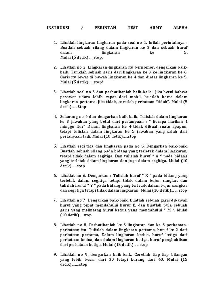 Tes army alpha ini sebenarnya menguji kemampuan kita menerima perintah dan mengerjakannya. Army alpha adalah alat yang sering digunakan oleh perusahaan untuk menguji tingkat konsentrasi calon karyawannya.semua pembahasan serta jawaban psikotes arm. Contoh soal psikotes army alpha dan jawabannya. Sep 26, 2020 · kunci jawaban army alpha 26 sep, 2020 posting komentar army alpha wikipedia interpretasi tes army alpha the army alpha is a group administered test developed by robert yerkes and six others in order to evaluate the many u s military recruits during world war i it was first introduced in 1917 due to a demand for a systematic method of evaluating the intellectual and emotional functioning of soldiers. Soal psikotes army alpha intelegency soal tes army alpha adalah sebuah tes psikologi yang dikembangkan oleh seorang psikolog amerika bernama arthur sinton otis ph d 28 july 1886 1 january 1964.